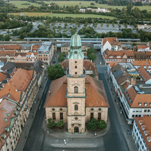 Die Kirche war ein Geschenk von Markgraf Christian Ernst und wurde zwischen 1686 und 1693 nach Plänen von Johann Moritz Richter in Erlangen erbaut. Mit der Grundsteinlegung am 14. Juli 1686 begann der Bau der Neustadt, der 52 m hohe Turm entstand erst 1732–36. Das Markgrafenpaar wohnte dem Gottesdienst in einer eigenen Loge bei. Besondere Beachtung verdienen die wertvolle Kanzel (1700) und die Barockorgel von Johann Nikolaus Ritter (1755–1764).