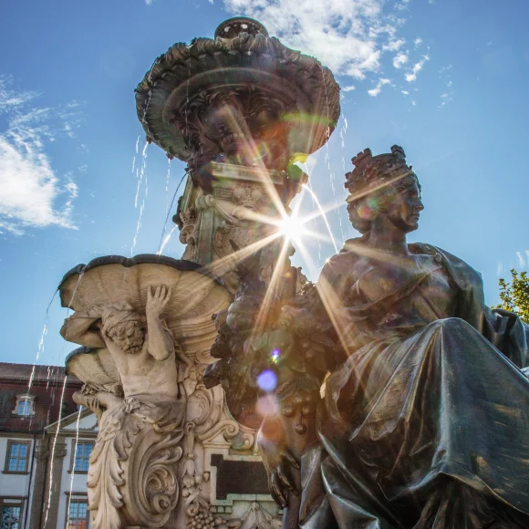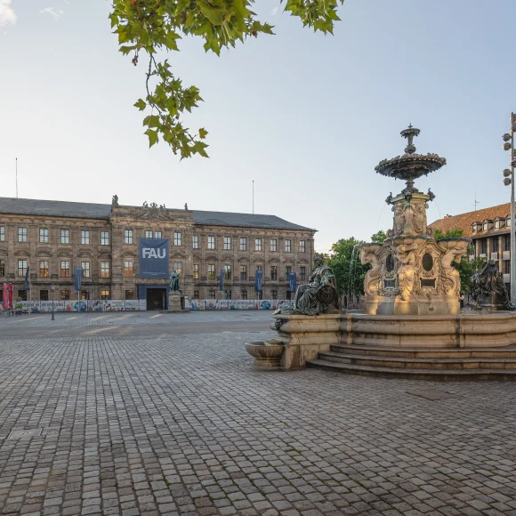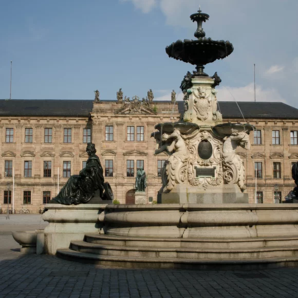 Der Platz beidseitig der Hauptstraße wird im Stadtplan von Johann Moritz Richter als „Grande place“ bezeichnet. Er bildet zusammen mit dem Hugenottenplatz das Zentrum der barocken Neustadt. Nachdem die östliche Seite (39 x 91 m) mit dem Bau des Schlosses als Cour d‘honneur oder Paradeplatz genutzt wurde, bürgerte sich ab 1745 die Bezeichnung Schlossplatz ein. Das Denkmal in der Mitte des Platzes, das der Erlanger Universität zum 100-jährigen Jubiläum vom bayerischen König Ludwig I. geschenkt wurde (1843), zeigt den Universitätsgründer Markgraf Friedrich. Zwei in den Boden eingelassene Tafeln erinnern an die Bücherverbrennung von 1933 und den Universitätsmechaniker Erwin Moritz Reiniger. Die Westseite (ebenfalls 39 x 91 m) diente auch nach dem Bau des Schlosses Marktzwecken und erhielt den Namen Marktplatz. Der Brunnen im Stil der Spätrenaissance (Entwurf: Friedrich Wanderer) wurde 1889 vom Kaufmannsehepaar Pauli gestiftet.