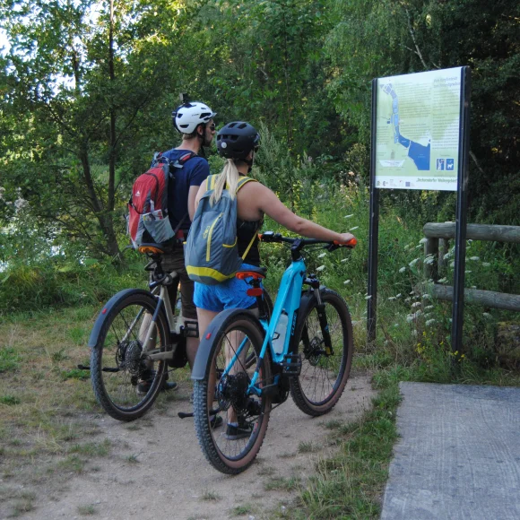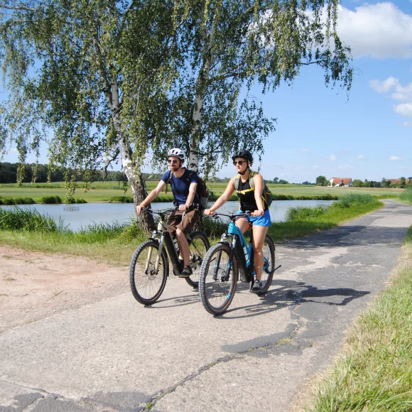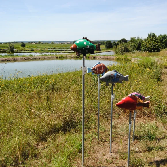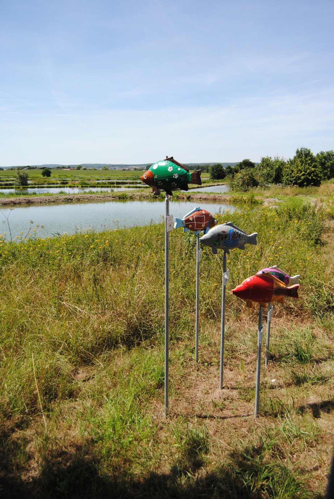 Vom Startpunkt an der Tourist-Information durchquert man die Unterführung am Hauptbahnhof zum Wiesengrund, der die östliche Grenze des Karpfenlands Aischgrund markiert. Von hier aus geht es zu den ersten Weihern im Erlanger Stadtteil Kosbach, in der noch aktiv Fischzucht betrieben wird. Über den Dechsendorfer Weiher hinaus führt die Tour entlang der vielen kleinen Teiche, die wie Perlen an einer Kette aneinandergereiht das Landschaftsbild prägen. Die typisch fränkischen Dörfer bieten mit ihren Landgasthöfen und Bierkellern die Möglichkeit zur Stärkung. Über Adelsdorf knickt die Route westlich ab Richtung Höchstadt. In der ehemaligen Kreisstadt lohnt sich ein kurzer Stadtspaziergang durch die historische Altstadt. Ab September gibt es auch hier den legendären, regionalen Spiegelkarpfen zu verkosten und als weitere Sehenswürdigkeit lohnt sich ein Abstecher zum Höchstädter Kellerberg. Hinter einem kurzen Abschnitt entlang der Bundesstraße warten schon die sanften, grünen Hügel mit idyllischen Orten. In Voggendorf grüßt am Fuße eines Bierkellers ein Radfahrerdenkmal mit Karpfen auf dem Gepäckträger, bis es dann ab Peppenhöchstadt verwinkelt quer durch die malerische Teichlandschaft geht. Ortsnamen wie Gottesgab spiegeln die Schönheit der dortigen Landschaft wieder. In Rezelsdorf führt der Weg nun abwechselnd durch Wälder und über Felder Richtung Erlangen, wo sich in Kosbach eine Einkehr ins Fischrestaurant anbietet.