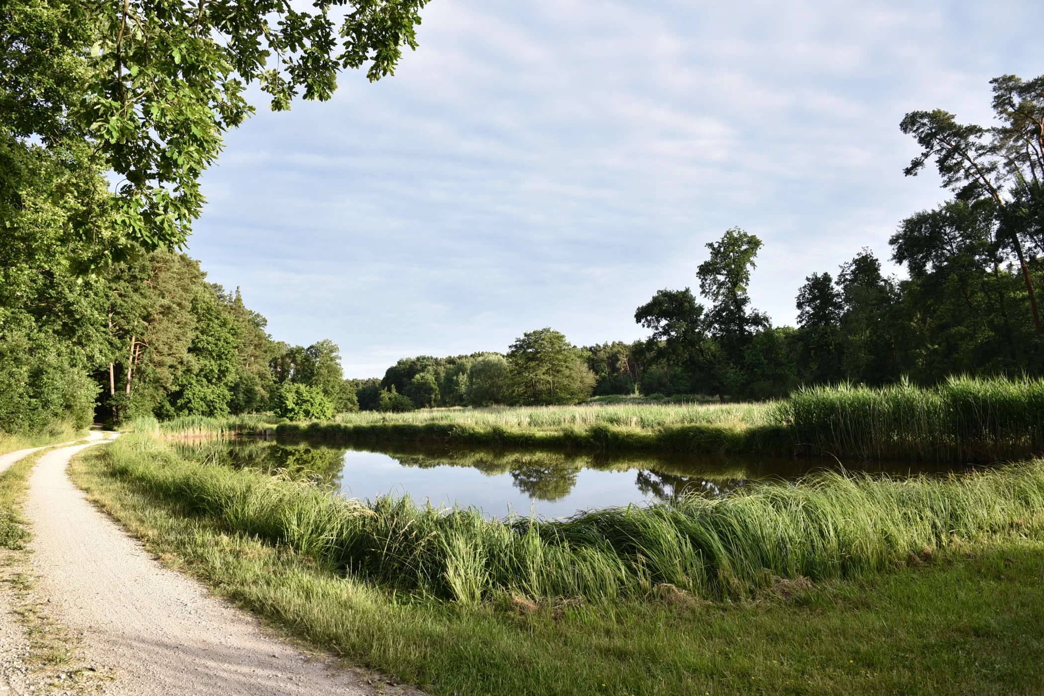 Die Himmelsweihertour startet im alten Ortskern „Brühl“ von Dechsendorf. Zwischen dem Gasthaus aus Sandsteinquadern und Fachwerk (1717) und einem Bauernhaus mit Fachwerkgiebel aus dem 17./18. Jahrhundert thront ein farbig gefasstes Holzkreuz mit Kruzifix (19. Jh.) und kleiner Pieta (18. Jh.) neben einem Bildstock aus Sandstein von 1507/1584. Am Ortsende taucht die Route in das Landschaftsschutzgebiet ein und öffnet den Blick in die weite Kulturlandschaft, die durchzogen ist von Wiesen und Feldern, Waldparzellen und großen Weiherketten. Am Kleinen Bischofsweiher kann man erstmals Wasservögel erspähen, unter den großen Eichen am Uferrand Platz nehmen oder Schwäne und Blässhühner an den wie Handtücher daliegenden Kleinstweihern gegenüber beobachten. Der Weg führt weiter zu einem verlandeten Moorweiher; nebenan lassen sich an den ufernahen Rohrkolben wunderbar Libellen studieren. Mittlerweile sind infolge der Klimaerwärmung diverse wärmeliebende Libellenarten aus dem Mittelmeerraum im Aischgrund heimisch, wie z.B. Feuerlibelle, Südliche Heidelibelle, Kleine Königslibelle, Schabrackenlibelle oder Kleines Granatauge. Die Route führt vorbei an den „Himmelsweihern“, deren blühende oder schilfbewachsene Dämme von Wasservögeln zum Rasten und Brüten verwendet werden. Als Himmelsweiher bezeichnet man den ersten Teich einer Kette oder einen Einzelteich im Wald mit sehr saurem und nährstoffarmem Wasser aus bodensauren Kiefernwäldern auf sandigem Untergrund oder direkt aus Niederschlagswasser. Wie in echten Mooren wachsen hier speziell angepasste Pflanzen, z.B. Torfmoose, Moosbeeren, der fleischfressende Sonnentau oder Bremis Wasserschlauch. Der Uferweg schlängelt sich weiter entlang der Kastenweiher – sie sind Teil des Mosaiks aus mitunter intensiv genutzten Weiherketten, die bereits im frühen Mittelalter im Aischgrund zur Produktion Aischgründer Spiegelkarpfen für die Fastenzeit angelegt wurden. Möglich machte dies die hiesige geologische Besonderheit sandiger, unrentabler Böden mit wasserstauenden Letten-Tonschichten im Untergrund. In heutigen „Naturteichen“ ohne Intensivzucht kommen auch andere gefährdete Fischarten wie Bitterling, Moderlieschen oder Schlammpeizger vor. Auf asphaltierter Straße durchquert man Röhrach und verlässt die Landstraße wieder mit Beginn des Wasserschutzgebiets – am Horizont die Wehrkirche von Hannberg. Der Wanderweg begleitet auf dem Rückweg die malerische Kronersweiherkette und den Moorbach und durchquert den Kiefernmischwald unterhalb des Eichelbergs. Eine Aussichtsbank lädt zur Rast an den Gemüsefeldern der Moorau ein und eine Infotafel klärt über naturnahe Teiche, Wiesen und Sandäcker im Moorbachtal auf. Als Besonderheit stechen immer wieder Moorweiher ins Auge, einerseits als Himmelsweiher im Wald, andererseits als Teichflachmoore, also flache Teiche mit nährstoffarmem Schlamm aus unvollständig unter Sauerstoffmangel abgebauten Pflanzenresten, deren moorähnliche (anmoorige) Bedingungen am Teichboden überlebenswichtig für darin lebende Pflanzen und Tiere sind. Uralte Eichen, ein Ameisenhügel und schön angelegte Sandsteingärten empfangen wieder in der Zivilisation.