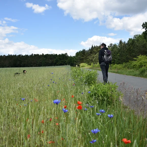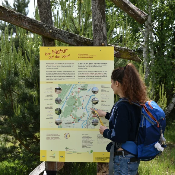 Den „Langen Johann“ Alterlangens im Rücken und im Landschaftsschutzgebiet angekommen, leitet die Starttafel in den Naturerlebnispfad ein. Ein erster Blick geht in die weite Talaue bis hinüber zum Burgberg. Entlang des Zauns des Wasserschutzkerngebiets erreicht der Wanderweg die „fränkische Wüste“, in der nur Spezialisten wie das Silbergras überleben. Hier lohnt ein Blick auf den spärlich bewachsenen Sandboden, aber auch die mit Misteln gespickten Kiefernkronen. Inmitten der Sandäcker ragt ein Holzgerüst mit Baumstamm-Schaukeln auf – eine Tafel erklärt hier das Wesen von Bienen, Wespen und Bienenwölfen, die sich als Räuber und Sandbändiger hervortun. Eine Station weiter ist über die rundherum blühenden Ackerwildkräuter zu lesen. Durch den „Steckeleswald“ schlängelt sich inmitten rotbrauner Spiegelrinden ein schmaler Waldpfad von Tafel zu Tafel, und man lernt mehr über die hiesigen kulturhistorischen Entwicklungen. Im Bereich von Station 5 ist es möglich, die Route zu halbieren und eine Abkürzung zu nehmen. Nur dort trifft man auf Tafel 15 mit Infos zum spannenden Jagdverhalten von Ameisenlöwen. Wer die Augen offen hält, kann ihre Trichter im Sand erspähen. Aber auch Eidechsen, Purpurspanner und die Meisterin der Tarnung, die blauflügelige Ödlandschrecke, leben hier im Sand. Durch Roteichendickicht hindurch, erreicht der Weg eine Tierweitsprunggrube und einen Sitzkreis aus Baumstämmen, der zum Verweilen einlädt und das wichtige Thema Totholz für Tiere aufgreift. Schließlich weitet sich der Blick auf eine große Lichtung, Lebensraum für Kaninchen und Ameisen, die hier als Gärtner und Höhlenbauer fungieren. Unweit des Main-Donau-Kanals und eines Brunnens erreicht man erst ausgedehnte Sandmagerrasen mit speziell angepassten Arten an diese sandigen, nährstoffarmen und trockenen Böden und später leuchtende Klatschmohnfelder. Wer Glück hat, kann sogar die rot ausgekleideten Brutröhren der Mohnbiene im Sand entdecken. Knorrige Kiefern und Spechthöhlen säumen den Weg, der zum zweiten Startpunkt der Tour am Ortseingang von Möhrendorf leitet – auch hier thront ein Startschild mit Flyerkasten neben einem von auf der Tour zahlreichen Insektenhotels. Wer Lust auf ein Eis hat, findet ganz in der Nähe einen kleinen Straßenkiosk zwischen dem kleinen Sport- und dem Wanderparkplatz. Die autofreie Straße teilt eingesäte Wildbienenweiden und weitere Sandmagerrasen, auf denen man das Zirpen der Feldgrillen in ihren Erdlöchern vernehmen oder über Nutzpflanzen lesen kann. Auf einer interaktiven Tafel verstecken sich Bewohner des Lebensraums Schilf, bevor die Tour in die Regnitzaue hinabsteigt. An der Wegkreuzung mit Rastbank und Wildblumenwiese bieten sich verschiedene Möglichkeiten: Wer besonders lecker einkehren möchte, wählt den (unmarkierten) Weg nach Norden zum Weiler Oberndorf mit einstigem Rittergut (Herrenhaus von 1796) am Oberndorfer Weiher; es lohnt aber auch ein Abstecher zu Station 11 – dem historischen Bauernrad, das traditionell zur Bewässerung der Wiesen genutzt wurde. Schnurgerade geht es weiter durch die weite Flur an Heckenstrukturen entlang. Man erfährt über die gefluteten Wässerwiesen und das von der Eiszeit geformte und vom Menschen geprägte Regnitztal, während man in der Ferne ein modernes, elektrisches Bewässerungs-Pumphäuschen am Fluss nahe des Erlanger Klärwerks erblickt. Inmitten wogender Felder steht Tafel 14 mit Erläuterungen zur Landwirtschaft der Talaue. Ein weiterer kleiner Abstecher lohnt sich – er bringt einen durch eine einmalige, verwunschene Heckenlandschaft zum Wald der Zukunft und zur Schwarzbauerngrube, einem Altwasser (ehemalige Flussschleife) der Regnitz mit zahlreichen Spuren des Bibers, riesigen knorrigen Eichen und Pappeln und Wissenswertem zu Hart- und Weichholzauen. Auf Wiesenpfaden geht es zurück am Erlegraben unterhalb der Eichenhutung entlang. Die letzten Stationen erzählen über geologische Entstehungsprozesse des Tals und die Bedeutung des Wassers; passend dazu kann man unterhalb des Wasserwerks auch einen Pumpbrunnen mit Teststationen ausprobieren. Duftende Robinien bringen einen zurück zum Erlenbruch mit Schilfbeständen, die auf hoch anstehendes Grundwasser in der lehmigen, feuchten Talaue hindeuten und zur Wasserreinigung beitragen. Der Blick auf die Erlanger Stadtkirchen macht deutlich, wie zentrumsnah dieses Naturparadies ist.