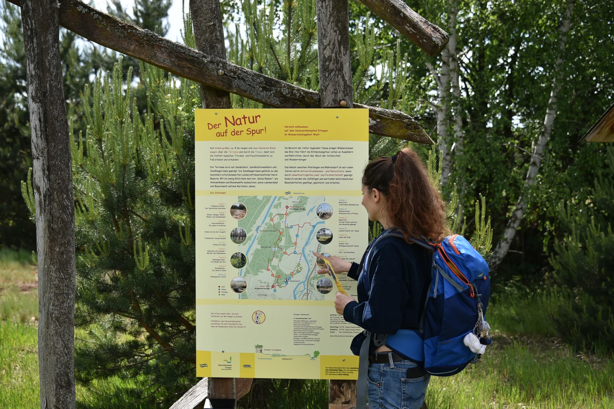 Der Naturerlebnispfad im Wasserschutzgebiet West zwischen Alterlangen und Möhrendorf umfasst 23 teils interaktive Stationen mit modernen Schautafeln und bietet große naturräumliche Vielfalt auf kurzer Strecke. Die Spaziertour verbindet die feuchten Regnitztalauen mit der höher gelegenen, trockenen Flussterrasse. Lichte Sandkiefernwälder, -äcker und -magerrasen stehen im direkten Kontrast zu Wässerwiesen, Auwäldern und Hecken.